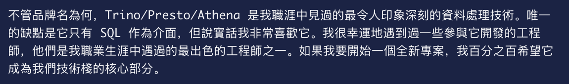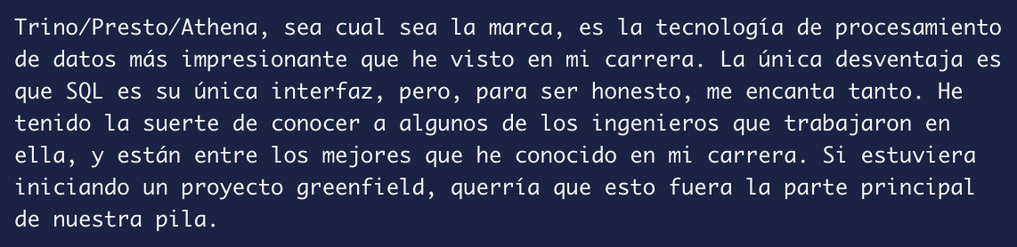 'Trino/Presto/Athena whatever the branding is, is the most impressive data processing technology I have seen in my career. The only downside is that SQL is its only interface, but honestly I love it so much. I have been lucky enough to meet some of engineers that worked on it and they are some of the best engineers I have met in my career. If I was going to a Greenfield project, I would 100% want this as the main part of our stack.'),