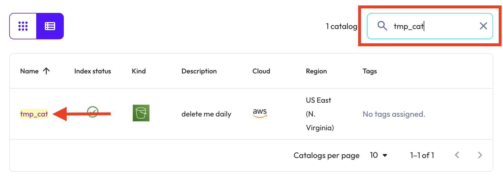 Navigate to Data > Catalogs from the left nav to see the list of Catalogs. Type tmp_cat in the search box to trim the list to only this catalog. Click on the cluster name link.
