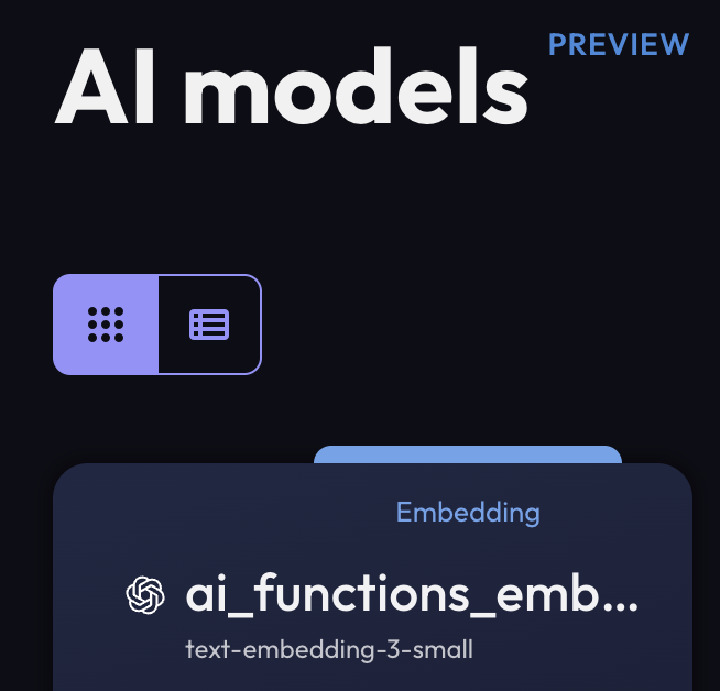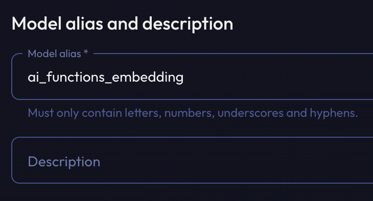 Set the Model alias to ai_functions_embeding and optionally add a Description.