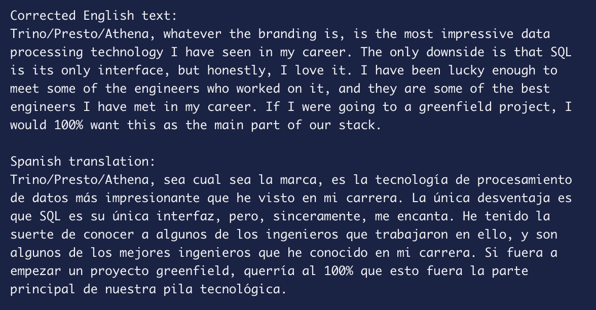 SELECT starburst.ai.translate(starburst.ai.fix_grammar(