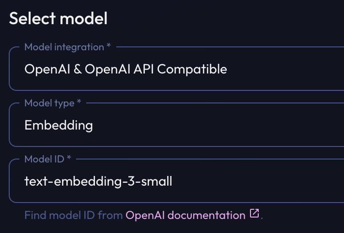Select Open AI & Open AI API Compatible for Model integration and Embedding for Model type. For Model ID enter a valid model such as text-embedding-3-small.