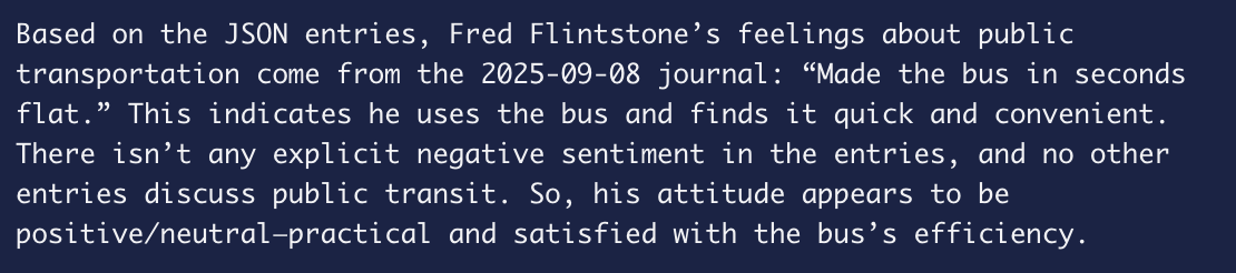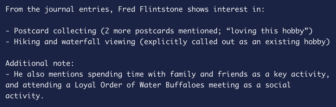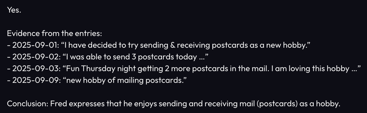If we asked things of a public LLM about Fred's interests or experiences that are only in this diary, we will not get an accurate answer. For example, I happen to know Fred, like me, is an active Postcrossing member and sends/receives postcards all over the world.