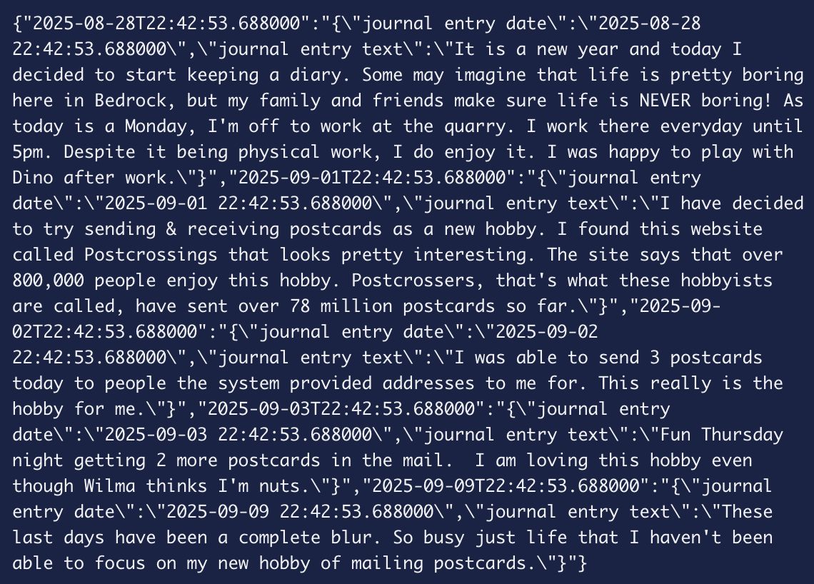 "2025-08-28T22:42:53.688000": "{\"journal entry date\":\"2025-08-28 22:42:53.688000\",\"journal entry text\":\"It is a new year and today I decided to start keeping a diary. Some may imagine that life is pretty boring here in Bedrock, but my family and friends make sure life is NEVER boring! As today is a Monday, I'm off to work at the quarry. I work there everyday until 5pm. Despite it being physical work, I do enjoy it. I was happy to play with Dino after work.\"}",