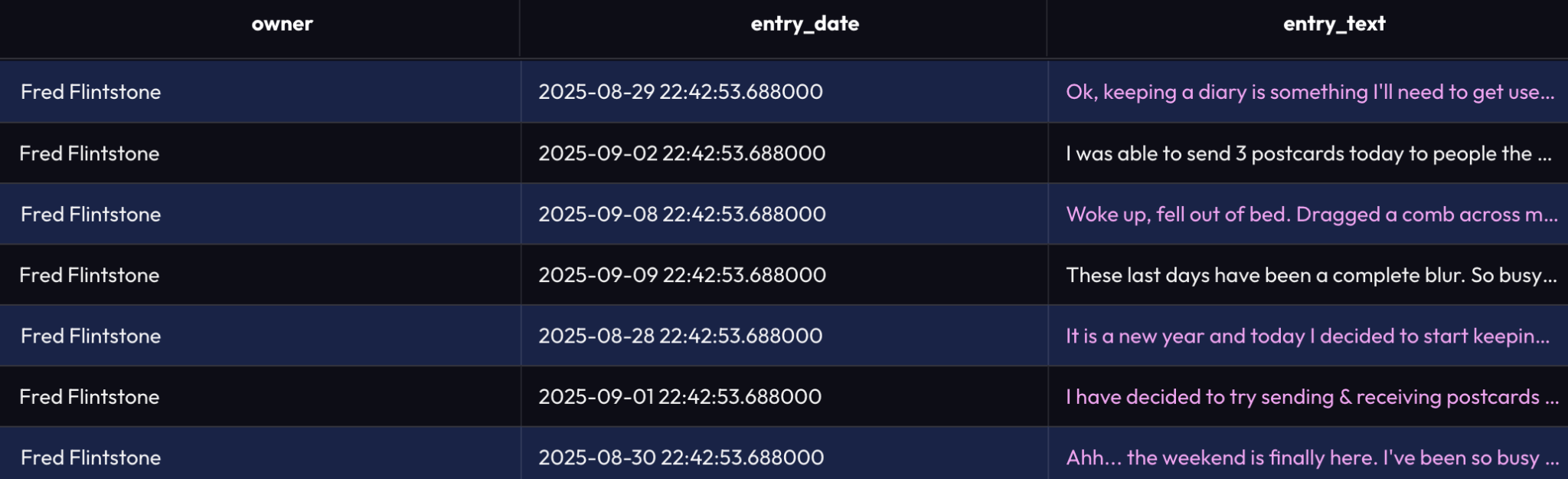Fred uses his stone-aged mobile device (hey, he's a fictional character so why not give him cellular service and internet access!) to record his journal entries. The good news for this tutorial is that we can just pick up at the point where there is an Apache Iceberg table that holds all the entries (was there an ice-age in the middle of the stone-age?).
