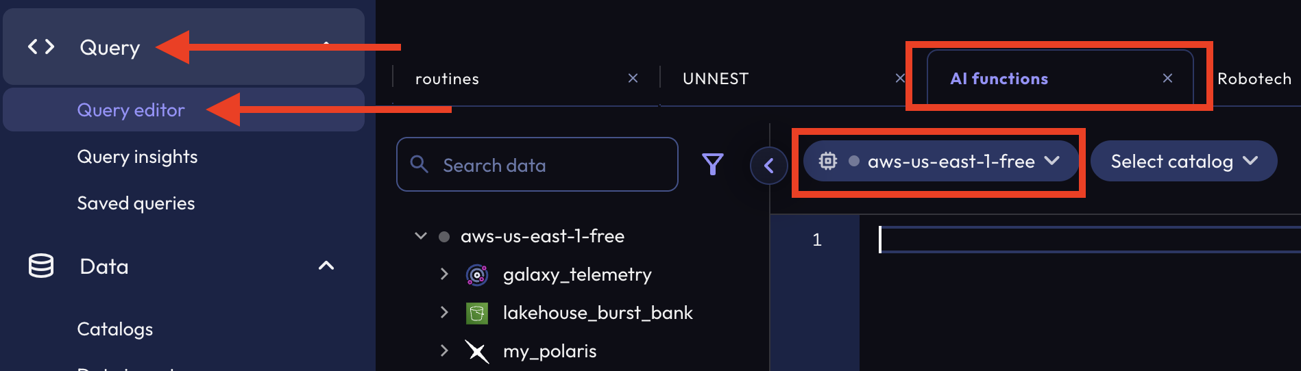 Navigate to Query > Query editor from the left nav, open a new editor tab, name it AI functions, and choose the aws-us-east-1-free cluster from the first pulldown menu.