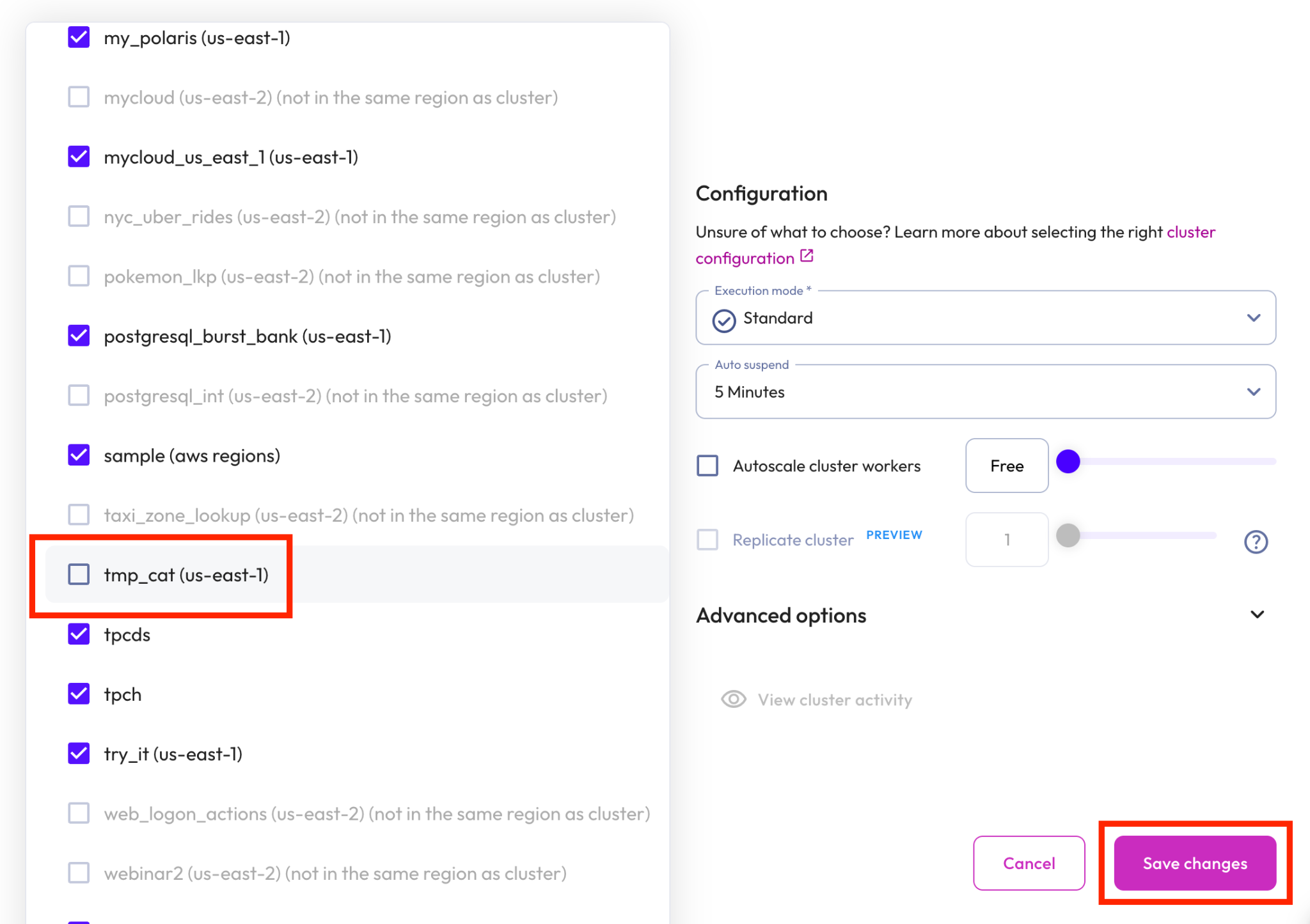 Uncheck the box on the for the tmp_cat (us-east-1) item in the list that surfaces, then click on Save changes.