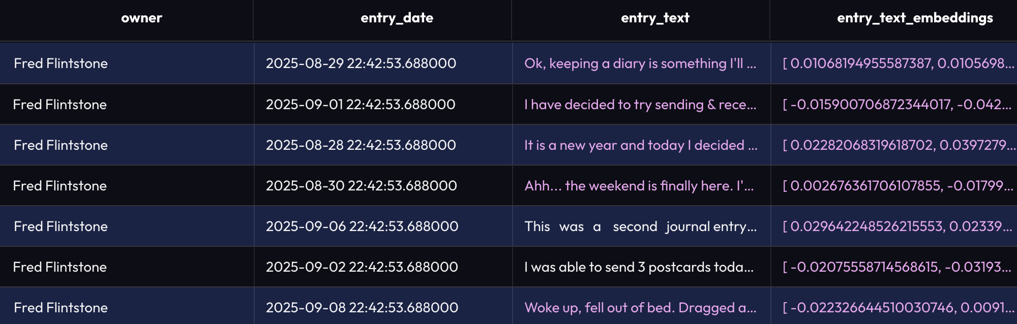 Fortunately, our simple use case didn't need to parse any unstructured data and the values in the entry_text column are appropriately chunked for the RAG workflow we are going to build. We just need to create vector embeddings of these journal entries and persist them somewhere.