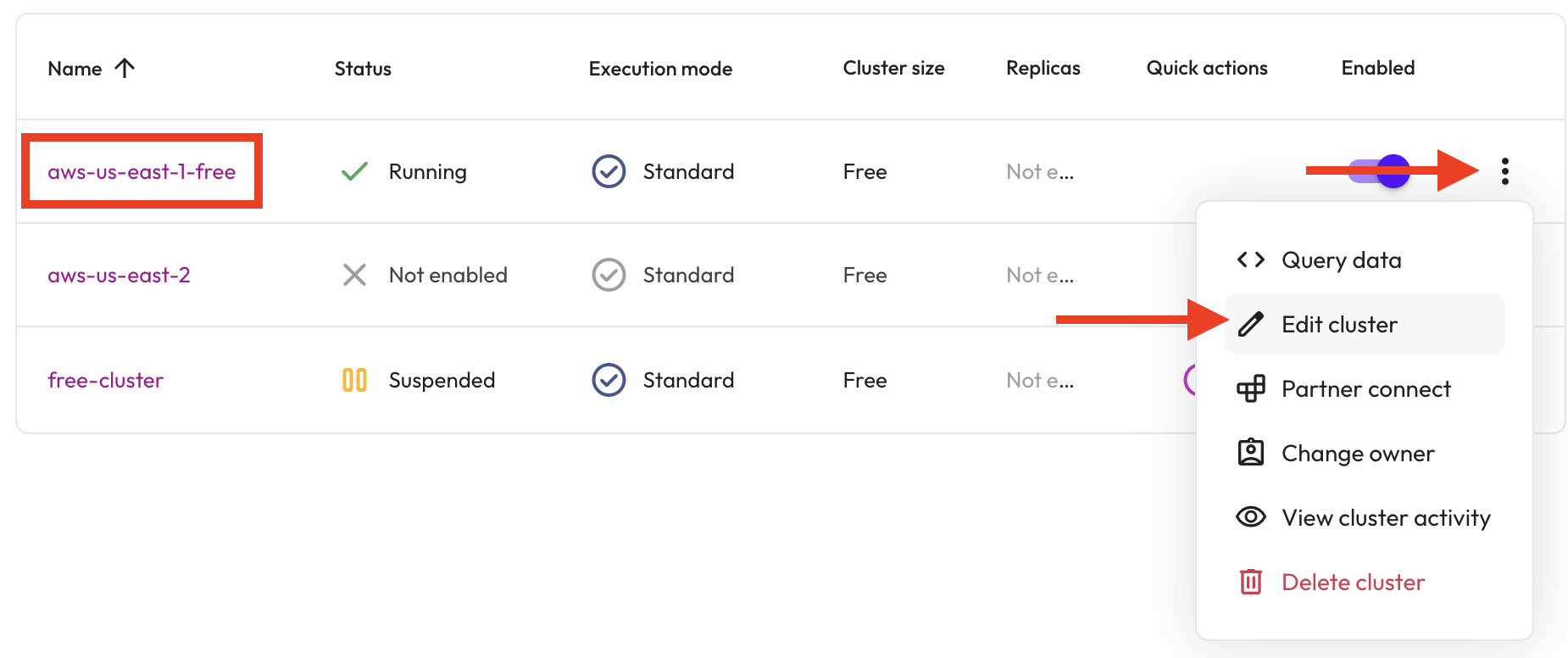 Find the aws-us-east-1-free cluster in the presented list and click on the vertical ellipsis menu icon on the far right of this row. In the menu that surfaces, click on Edit cluster.