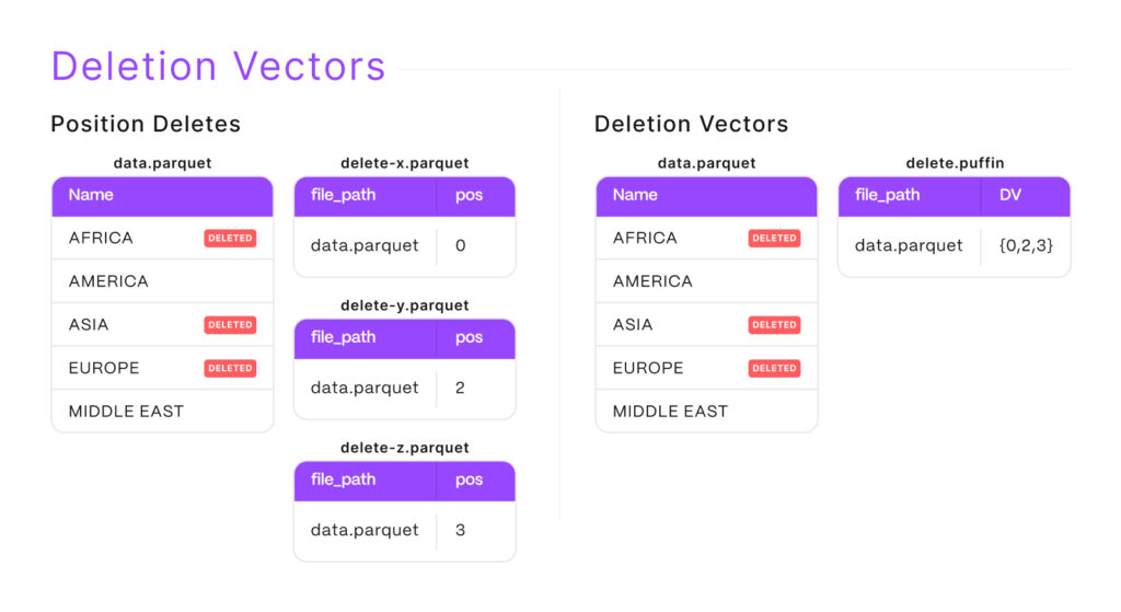 With the sprawl of v2 positional delete files comes more and more file I/O which decreases performance and increases costs. The v3 deletion vector files ensure that for a given snapshot there will never be more than a single deletion file aligned to each data file. Performance doesn't keep degrading as more and more deletions occur and we prevent cost spikes for data lake solutions who charge on the number of GET operations.