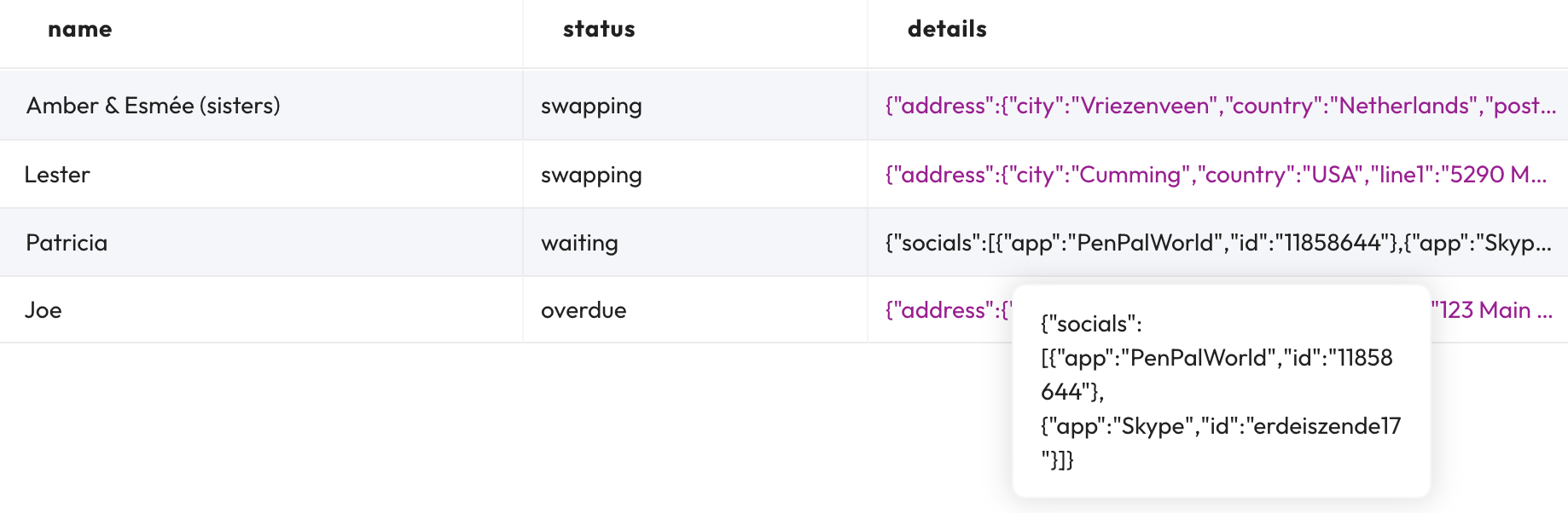 (name varchar, status varchar, details JSON)