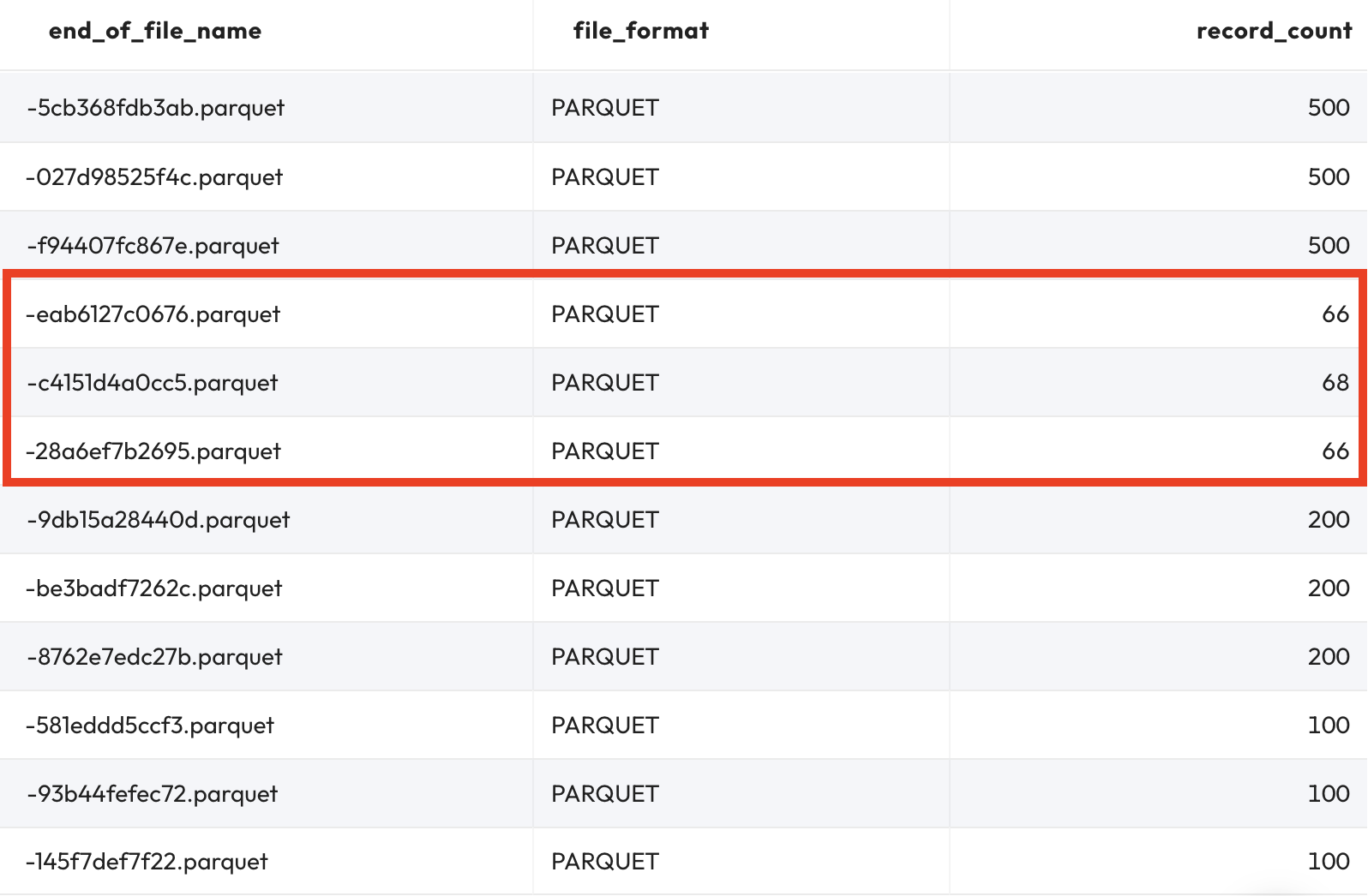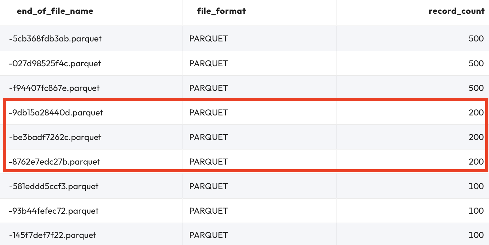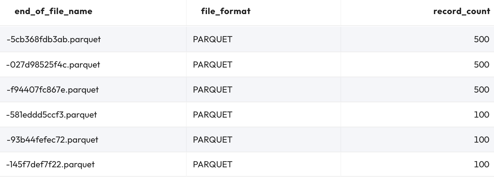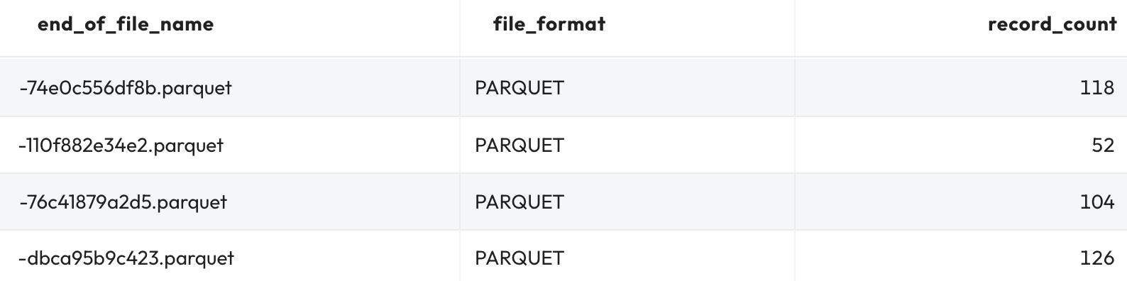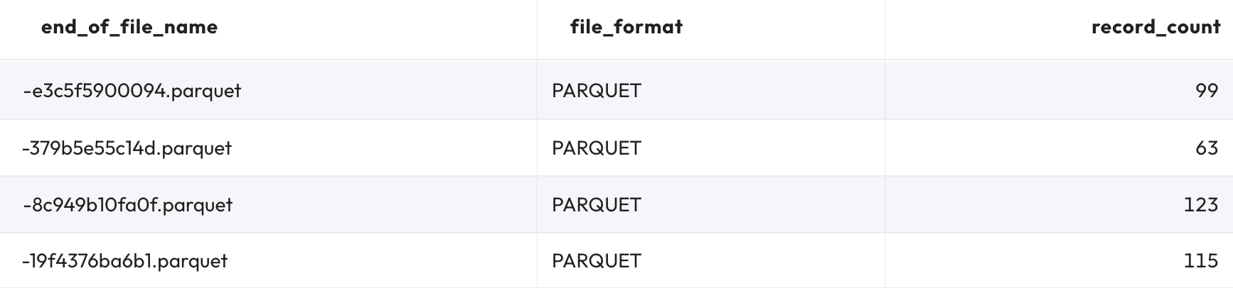 In fact, the total number of records across these files equals 400 as it should be. This verifies that none of these Parquet files are delete files; each is a ‘normal' data file.