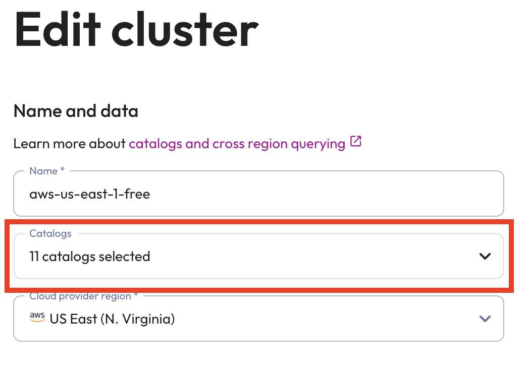 In the Edit cluster configuration screen, click on the Catalogs pulldown menu.