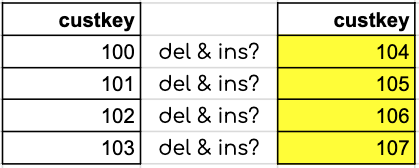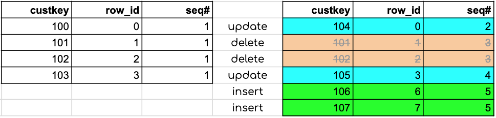 -- row_id 0 and 3 (orig custkey 100 & 103) where UPDATED
