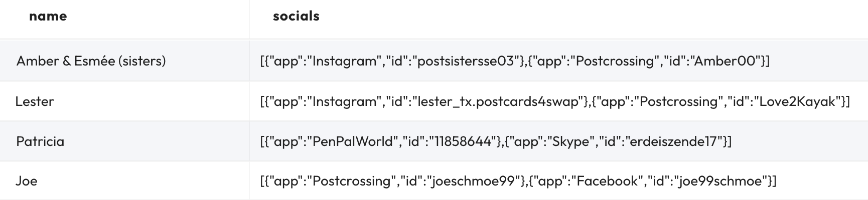 ('Amber & Esmée (sisters)', 'swapping', JSON '