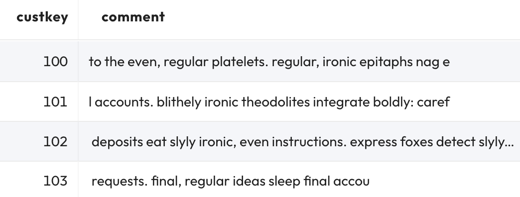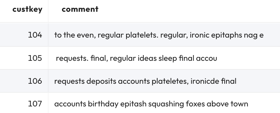 SELECT * FROM cust_without_rowids ORDER BY custkey;