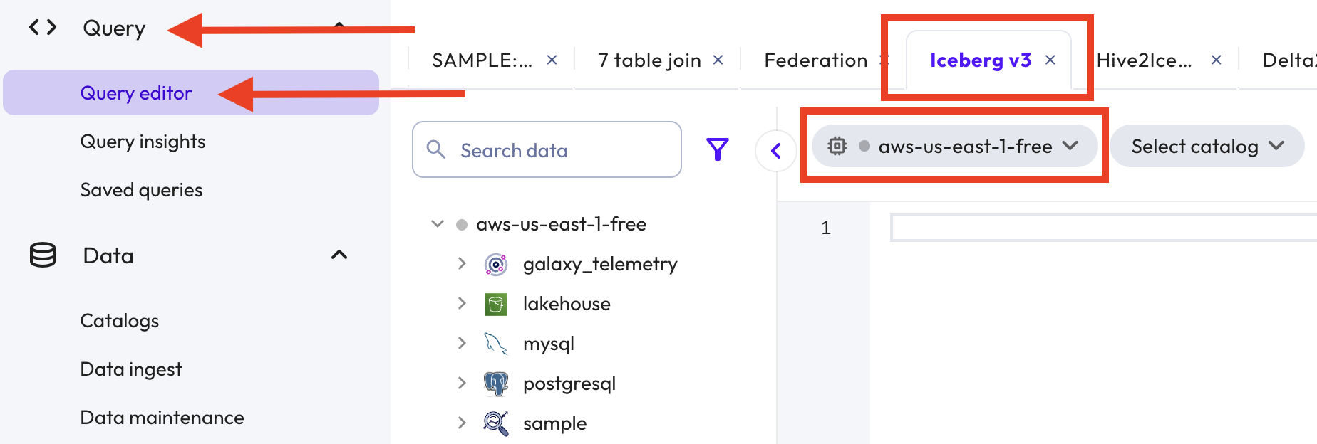 Navigate to Query > Query editor from the left nav, open a new editor tab, name it Iceberg v3