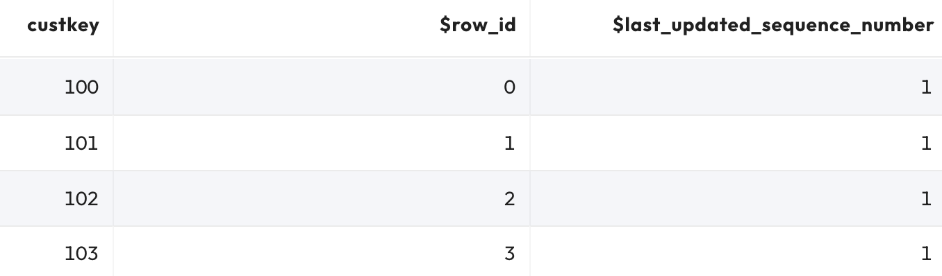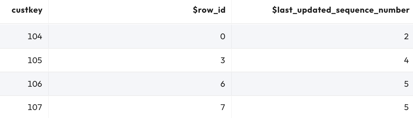 SELECT custkey, "$row_id", "$last_updated_sequence_number"