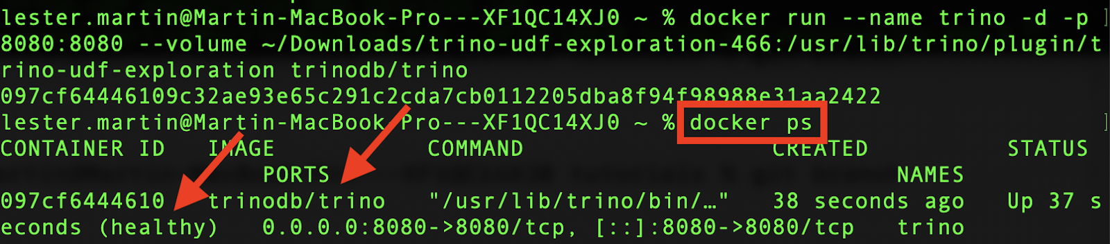 docker run --name trino -d -p 8080:8080 --volume YOUR-UNZIPPED-DIR:/usr/lib/trino/plugin/trino-udf-exploration trinodb/trino