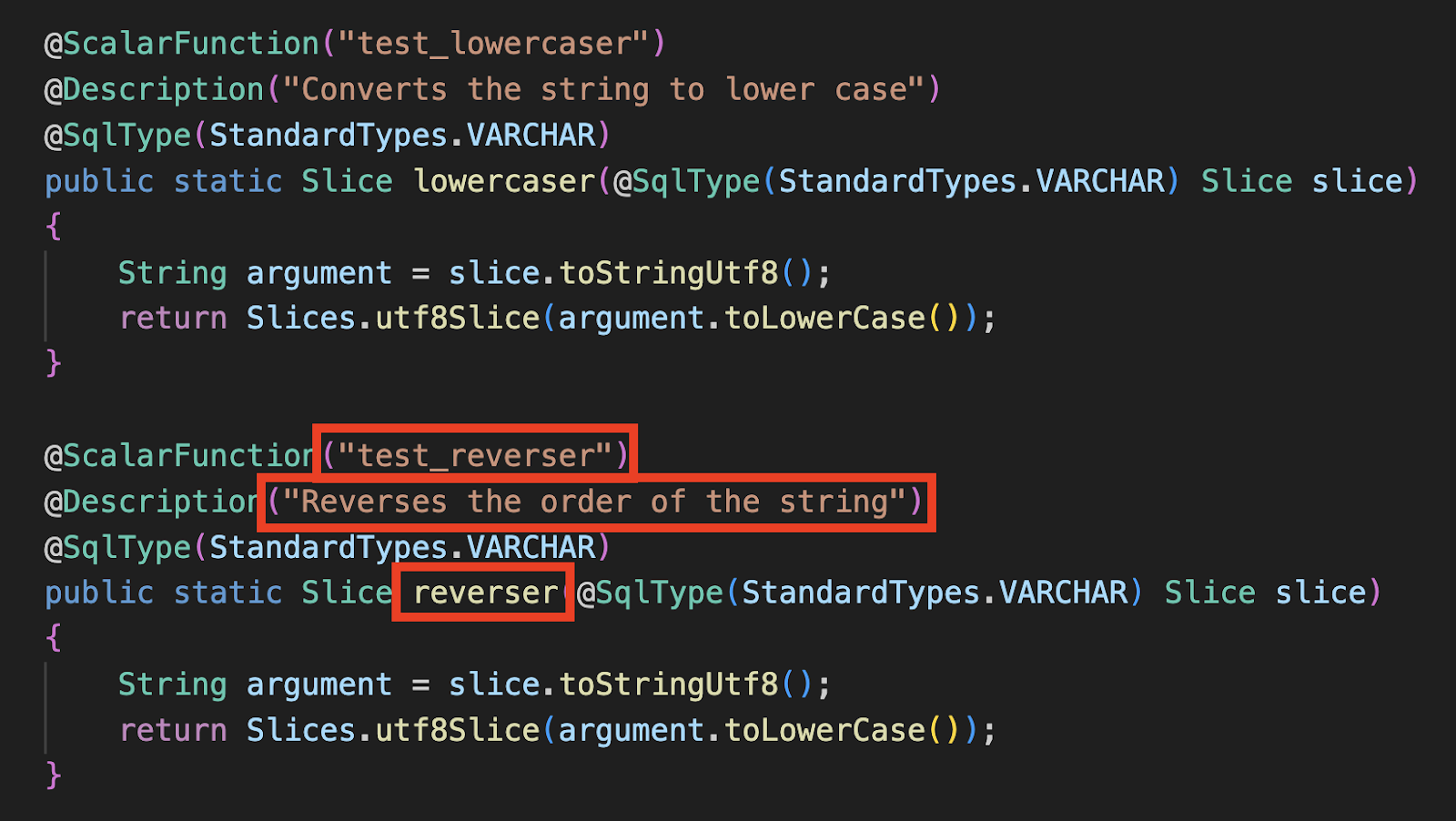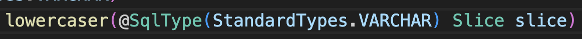 annotation above the method name indicates the data type that the scalar (i.e. row-level) SQL function will return.