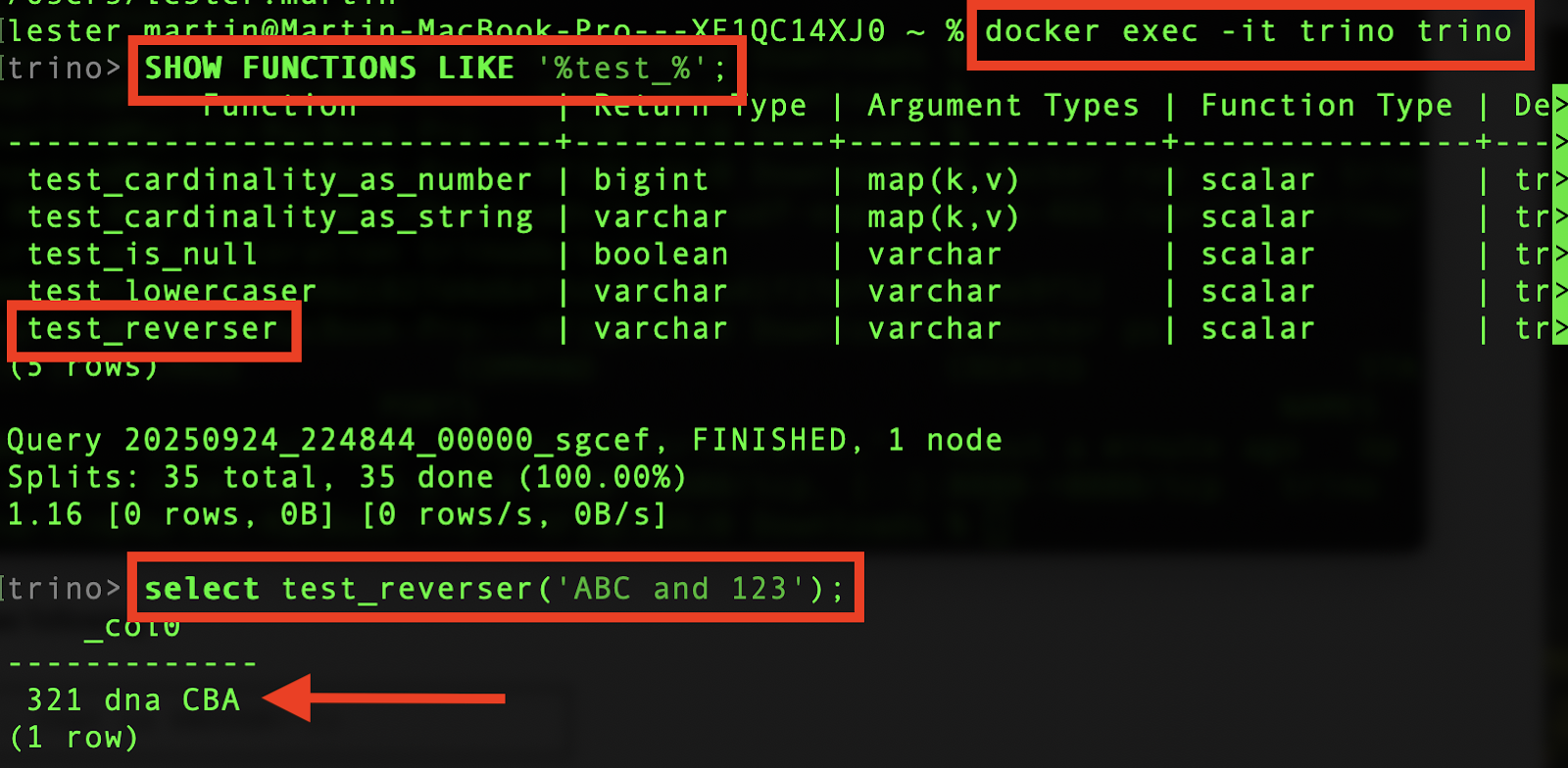 Start the Trino CLI, verify the new function exists, and verify it works correctly..