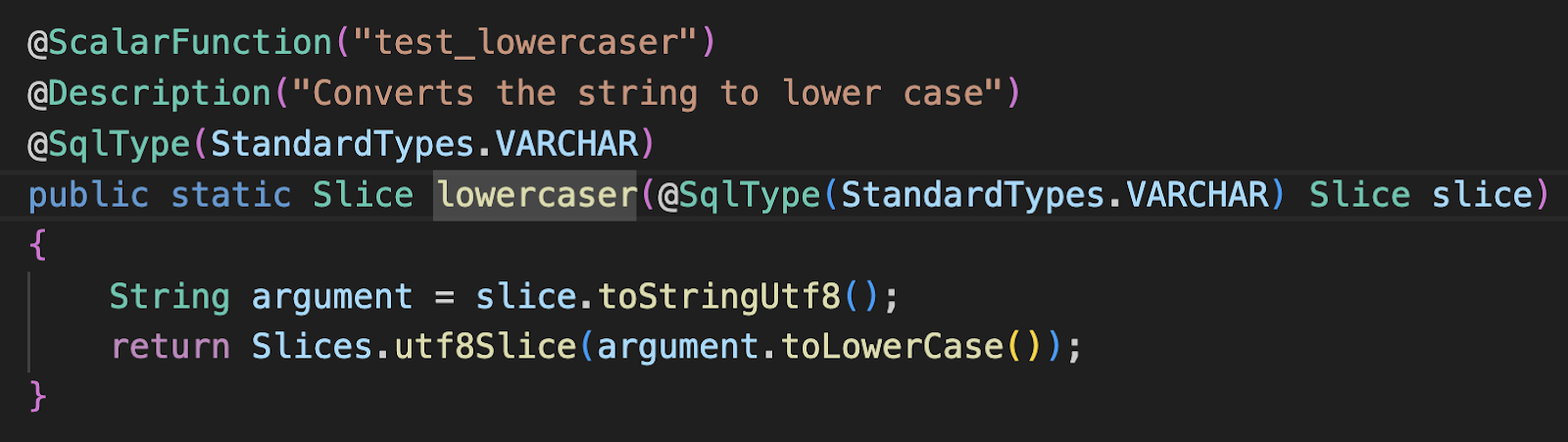 This Create a Trino UDF function with Java tutorial assumes you are conceptually familiar with Trino as a query engine, confident with SQL, and are interested in building your own User Defined Function (UDF). Additionally, it is assumed you are comfortable programming in Java and have a foundational knowledge with Git and Maven.